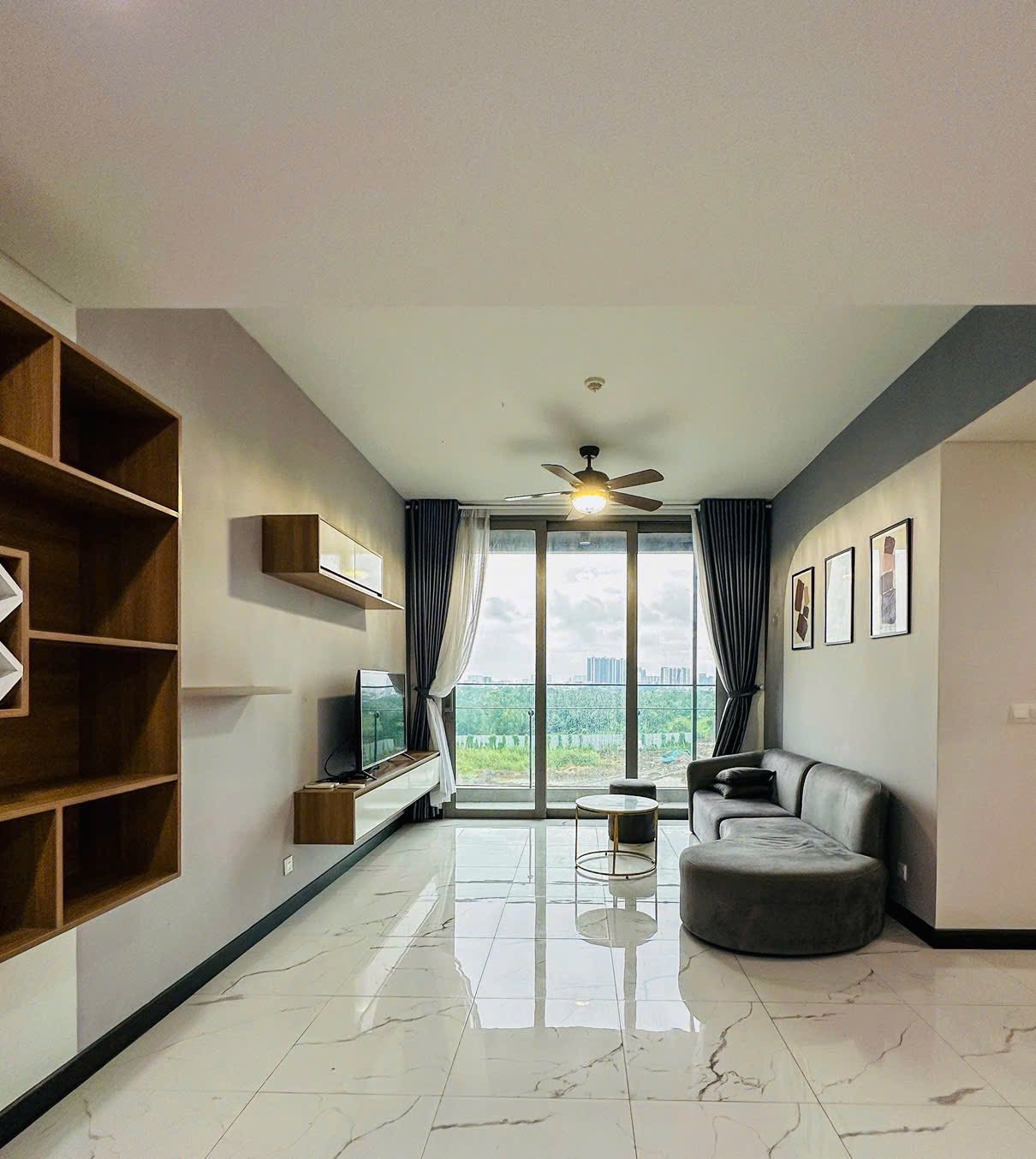 Phòng khách rộng thoáng, kết nối trực tiếp với ban công lớn đón ánh sáng tự nhiên.